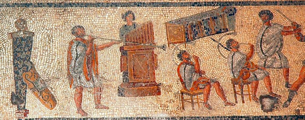 Fig. 1 – Mosaico 200 d.C. Una tromba diritta e due buccine a forma di G.