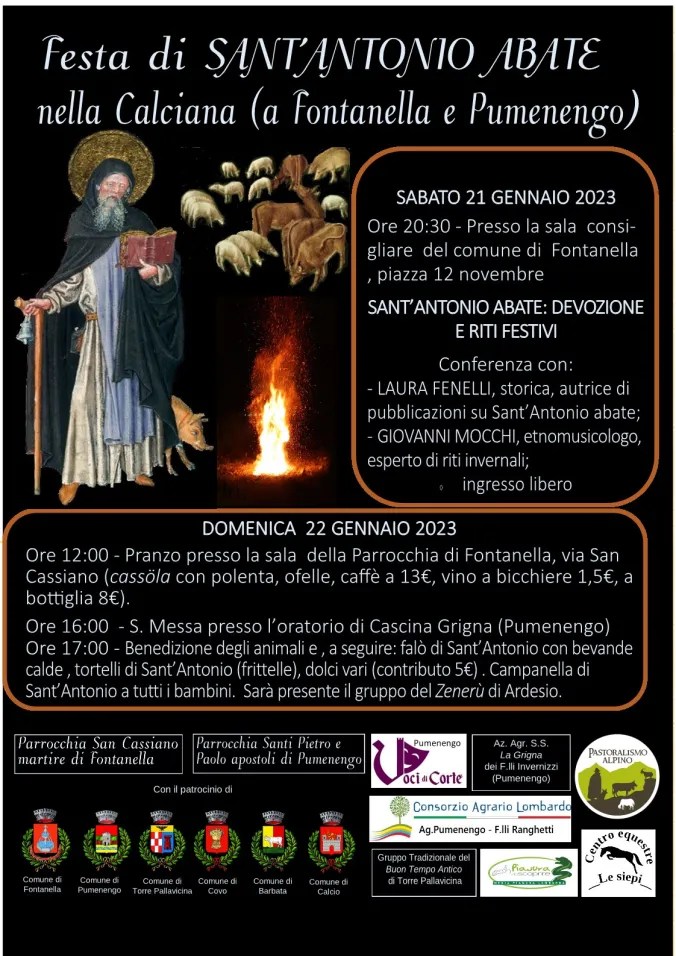 Nel week-end 21-22 gennaio 2022 a Fontanella è stata organizzata la Prima Festa di Sant’Antonio abate nella Calciana (la bassa pianura bergamasca orientale). L’evento ha compreso una conferenza storica sulla figura e il culto di Sant’Antonio abate presso la sala consigliare (sabato sera), con un pranzo comunitario presso la sala parrocchiale la domenica mattina, con la Santa Messa, benedizione degli animali e falò alla frazione rurale Grigna di Pumenengo.