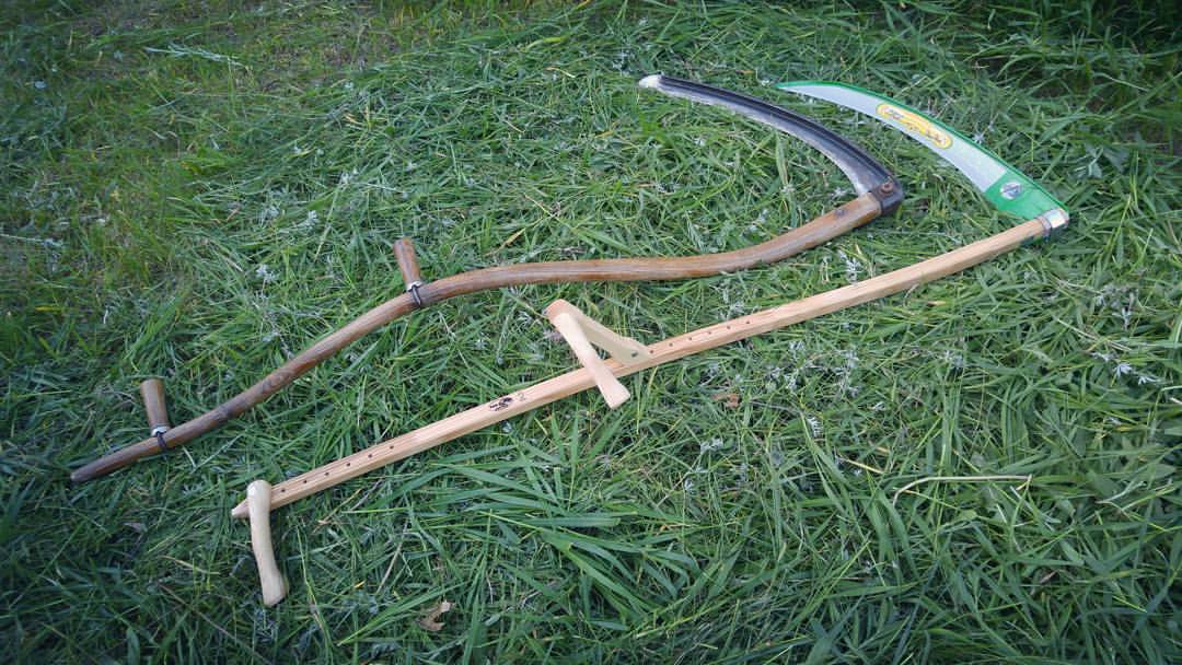 A sinistra manopole alla lombarda, al centro una falce con una sola manopola, tipica del centro-sud. Mano a mano che si scende nella penisola l’uso della falce era meno importante e la falce poteva assumere l’aspetto di quella a destra: senza manopole e corta. Nel Sud insulare la falce è stata introdotta solo nel primo Novecento. Falci di questo tipo, però, erano usate anche al Nord per utilizzi particolari (taglio dell’erica delle brughiere, fieno “selvatico”).