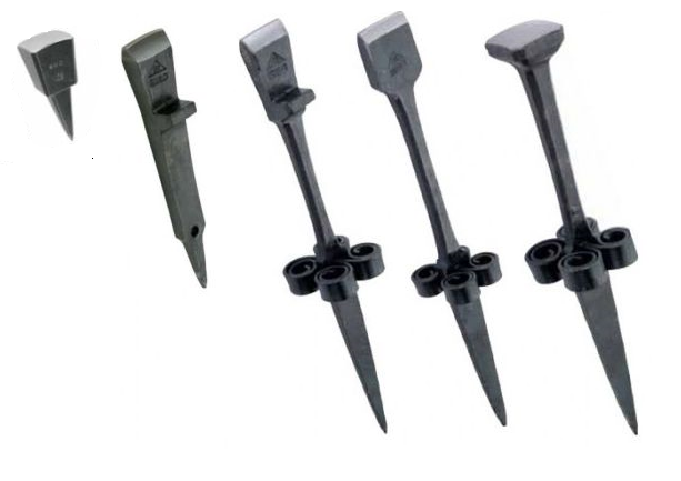 Per battere la lama sui diversi tipi di incudine servono ovviamente modelli diversi: testa piana con incudine a spigolo, testa a spigolo con incudine piana. La superficie di battitura deve essere limitata a 2 mm dall’orlo della lama se la battitura deve risultare efficace.