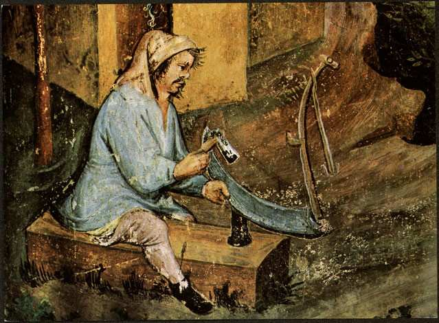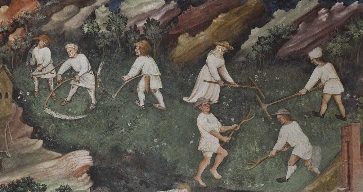 Nell’affresco del maestro Venceslao sono riportati con dettaglio e realismo alcuni particolari come la martellatura del filo della lama della falce. Oggi, spesso, la lama si stacca dal manico per svolgere questa operazione. Per non perdere tempo questo falciatore della dine del XIV secolo, usa un puntello per sostenere il manico. Il modo di tenere in mano la lama è lo stesso ancora oggi.