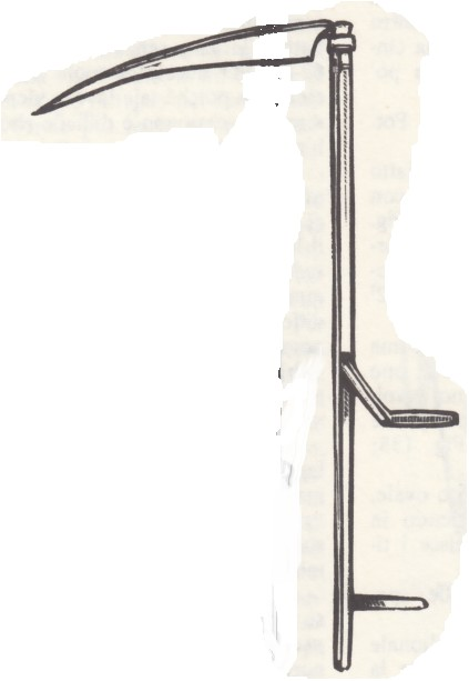 Da osservare che tutti i manici (le figure sono tratte dal classico lavoro di P. Scheuermeier “Il lavoro dei contadini” sono diritti mentre nell’affresco della Torre Aquila si osservano dei manici ricurvi, come quelli attuali in ferro. Il manico di legno curvo “arcaico” si è curiosamente mantenuto negli Stati Uniti, evidentemente importato da coloni di cultura conservativa, mentre in Europa si affermava il manico diritto.