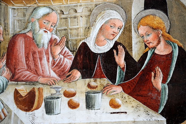 La documentazione iconografica più antica – almeno a mia conoscenza – relativa ad un formaggio con caratteristiche esteriori simili al Bitto, risale al 1470 e riguarda un affresco (le nozze di Cana) del ciclo della vita di Gesù dipinto dal pittore clusonese Giacomo da Buschis detto Borlone. Sulla tavola, oltre a dei pani, un formaggio duro e verosimilmente ben stagionato.