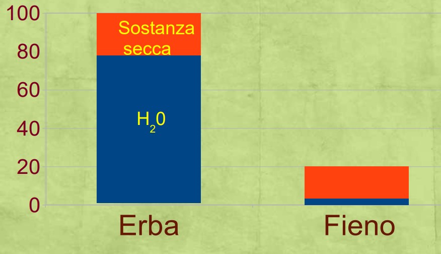 L’erba appena falciata contiene circa il 78% di acqua. Da 100 kg di erba si ottengono 20 kg di fieno con 20% di acqua. Purtroppo non si perde solo acqua ma anche sostanza organica (20-25% di quella iniziale). Con la fienagione non si perde solo quantità di sostanza organica ma anche qualità; si perdono sostanze digeribili e molto nutritive (zuccheri, vitamine, proteine). Le perdite di sostanza organica sono dovute alla respirazione (forti fino a quando il contenuto di acqua non scende sotto il 40%, limitate sino a quando l’umidità scende al 10% quando si bloccano le reazioni ), al danno meccanico (specie per la perdita di foglie- più ricche di sostanze nutritive – che si staccano dagli steli e restano sul campo), alle fermentazioni da parte di batteri presenti nel terreno e sulle piante. Le perdite meccaniche sono determinate dalla ripetizione delle operazioni di rivoltamento, spandimento, formazione delle andane ma anche dalla velocità degli organi in movimento delle macchine. Le perdite fermentative avvengono quando il fieno è in mucchio o in andana e poi in fienile (dove il fieno, se umido e se i fienili non sono ventilati può continuare a “bollire” e raggiungere i 60°C di temperatura e causare incendi).