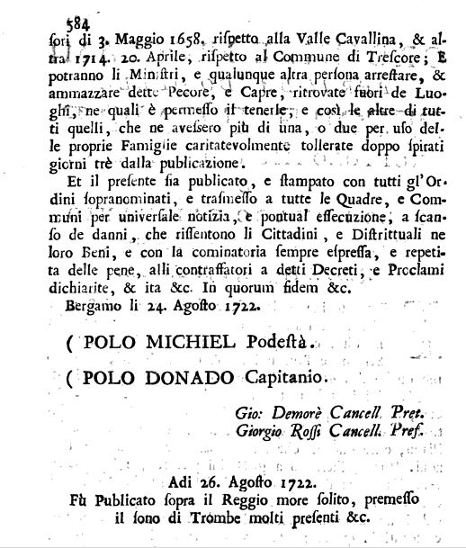 Un “proclama” del 1658 ed una successiva “regolazione” del 1659 costituiscono un provvedimento organicamente teso a porre rimedio ai “danni che di Animali Pecorini e Caprini vengono inferiti ne Beni de particolari e de Luoghi Pij, danni grandi, molesti, irreparabili” a r venire incontro alle lamentele per tali danni e per “le prepotenze e per la temeriarietà de Pastori e Pecorari”. Tali “atti così violenti” erano causa di limitazione alla libertà di godimento dei propri beni per i singoli proprietari, ma anche di “publico rilevantissimo pregiudizio”. Si stabiliva pertanto che nessuno “ardisca per l’avvenire introdur, tener, o alloggiar Pecore, o Capre d’alcuna sorte nel Territorio bergamasco, e nei luoghi suburbani di questa Città (…) ma dette Pecore, e Capre siano e s’intendano assolutamente proibite, e perpetuamente bandite da Bergamo e Bergamasco”. Nelle intenzioni del legislatore doveva essere eliminata la pastorizia transumante mentre veniva concessa la sopravvivenza dell’allevamento ovino nelle zone di montagna che vengono così elencate: “Valle Brembana Superiore, e Brembana inferiore, Val Brembana oltre la Gocchia, Val d’Imagna, Vicariato d’Almenno, Val S.Martino, Val Seriana Superiore et Inferiore, et Val Gandino dovendosi in altre intender eccettuata la Val Cavallina dal Borgo di terzo in su verso i Monti, e quelle Terre ancora, che sono oltre il Porto di Caleppio pure verso i Monti”. Le pene previste per i trasgressori erano severissime: “tutte le Pecore, e Capre, che saranno ritrovate nel Bergamasco (…) siano e s’intendano immediatamente perdute” chiunque le trova può appropriarsene “ammazzarle, e convertire in proprio benefizio”. I pastori trasgressori “debbono essere fermati prigioni etiamdio con suono di campana a martello, al quale dovranno concorrere gli uomini de Comuni con le loro armi, perché si seguisca l’arresto a tutte le maniere” ed ai trasgressori “pene di Corda, Galera, Prigione o pecuniaria”. Al fine di troncare “sì perniciosa, et abborrita violenza” viene “proibito a chi si sia (…) prestar ricetto, alloggio, o ricovero a Pecore, o Capre bandite, né a loro Pastori, Conduttori, o Custodi”. Tanto rigore era mitigato da una serie di eccezioni che ci consentono di conoscere di quale grande utilità fossero al tempo gli allevamenti ovi-caprini . Vengono infatti esentate le “terre da salnitro” con annessi allevamenti ovini, dove le deiezioni consentivano la produzione dei nitrati, materia prima della polvere da sparo. Otto Terre da salnitro con duecento pecore ciascuna vengono autorizzate in ciascuna circoscrizione del Territorio. Viene anche consentito ai Comuni di ottenere licenze di “tener pecore” sul proprio territorio purché facciano domanda ben documentata con indicazione del perticato e “nota di tutti gli animali” e approvata a maggioranza qualificata. Inoltre erano ammesse in Città “Capre in poco numero” “per uso d’ammalati” e soddisfatte le necessità della “Beccaria” (macellazione) nella “quantità che sarà riconosciuta bisognevole”. Salvo queste eccezione “nessuna deroga per nessuno” e contro i trasgressori “possa e debba procedersi anco per via d’Inquisizione e sopra Denonzie secrete”. Infine ai pastori veniva proibito di “portar Archibugi da roda, o d’azzalino di qual si voglia sorte”. Tale disposizione riprendeva una “grida” dello stesso anno in cui si diceva che “li pecorari fatti audaci (…) dall’andar armati d’archibugi lunghi e curti” e da protezioni di “soggetti prepotenti ed autorevoli, senza riserva niuna essercitano l’insolenza ”.