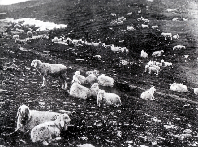 Seguiamo ora il pastore del suo gregge. Il gregge sfrutta dapprima i pendii vicini ai villaggi fino a metà Giugno, circa; poi si unisce con altri, formando greggi numerosi di un migliaio di capi e sale sulle montagne. La trova i pascoli presi in affitto.
