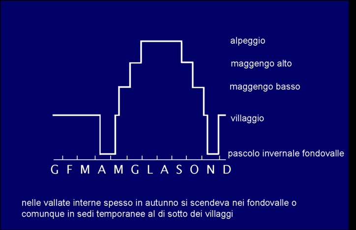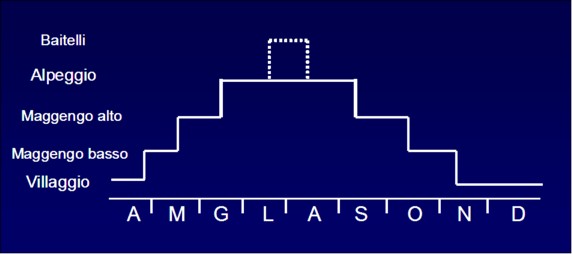In estate il bestiame dei tanti piccoli proprietari si radunava sui pascoli in quota degli alpeggi e formava una mandria unica sotto la guida dei pastori per un periodo di circa 3 mesi. In questop modo la maggior parte dei contadini-allevatori, affidato il proprio bestiame in mani sicure, poteva restare sui maggenghi e al villaggio a fare fieno e a svolgere altri lavori agricoli.