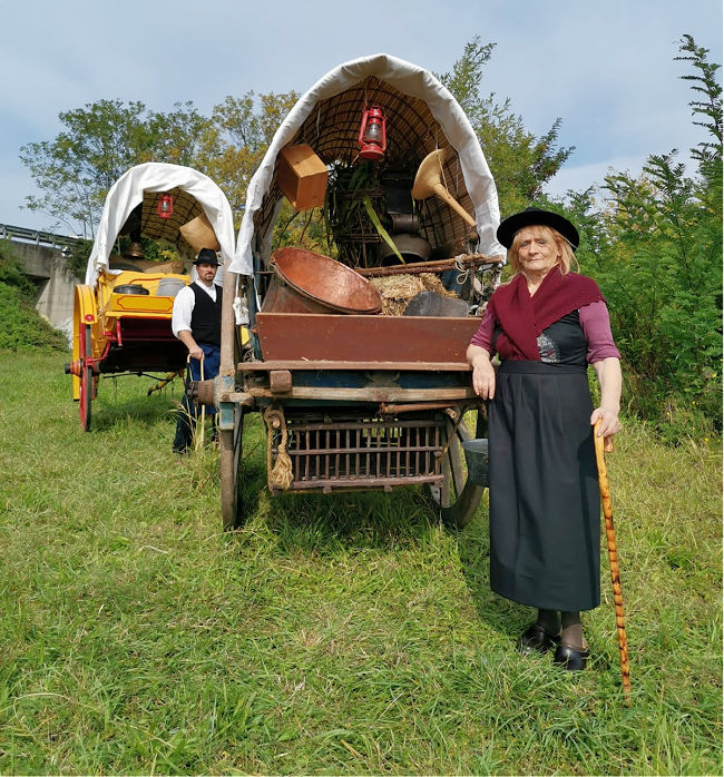 Carri: I carri della transumanza erano carri agricoli (i più grandi, per la verità, da carrettiere) con due grandi ruote. Dovendo risalire le valli (almeno fino a dove esistevano strade carrarecce) le due ruote garantivano la necessaria manovrabilità nelle curve strette delle strade di montagna. I carri sono stati utilizzati per la transumanza dalla metà dell’Ottocento alla metà del Novecento. Ancora all’inizio degli anni ’50 del secolo scorso, i carri venivano caricati sui treni della transumanza, su carri ferroviari scoperti, in convogli con i carri bestiame. Servivano per l’ultima parte dei percorsi (es. da Lecco alla Valsassina, da Piazza Brembana all’alta valle). Prima della metà dell’Ottocento, dai primordi della transumanza, tutto il materiale era trasportato someggiato con i cavalli, sistemato in gradi ceste. Per la Transumanza 2021 verrà inaugurato un carro completamente restaurato (con rifacimento di diverse parti) dal socio Stefano Manzoni.