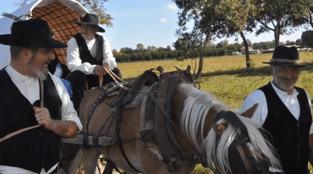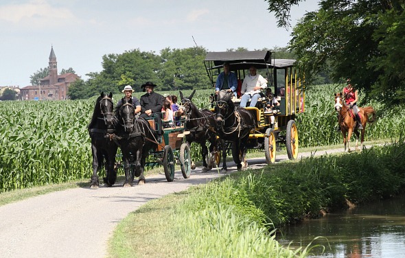 Carrozze: “Mule di San Cipriano”, Chieve (Cr). L’associazione sportiva dilettantistica possiede robusti cavalli e delle poderose mule che vivono in piena libertà in spazi totalmente diversi da quelli che si è soliti associare a scuderie e maneggi. Gli animali, cavalli di varie razze, potenti ma anche agili e docili, entrano ed escono liberamente dai ricoveri. Anche l’alimentazione, che esclude completamente i mangimi pellettati, è del tutto non convenzionale. Con due moderne carrozze, un omnibus da 18 posti e una carrozza più piccola da 10 posti, l’associazione organizza percorsi tra le cascine su strade bianche nel contesto di una ruralità più inglese che padana ma del tutto autentica. Alle redini Alberto Mariani, anima dell’associazione e suoi amici. le due carrozze delle “Mule” accompagneranno coloro che intendono partecipare alle visite guidate nei dintorni delle tappe di Rivolta, Pandino, Monte Cremasco e Dovera. A Lodi vecchio, per il gran finale del 3 ottobre, garantiranno un servizio navetta tra la piazza principale, la basilica dei XII Apostoli (San Bassiano) e il Museo Laus Pompeia.