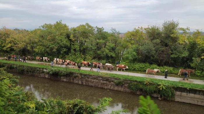 I bovini che parteciperanno alla Transumanza provengono da stalle di Serina in val Brembana. Hanno trascorso insieme l’estate in alpeggio in alta valle rientrando a piedi alle stalle in paese. Sono animali rustici (duplice attitudine), che pascolano anche nelle stagioni intermedie compiendo sempre discreti spostamenti.